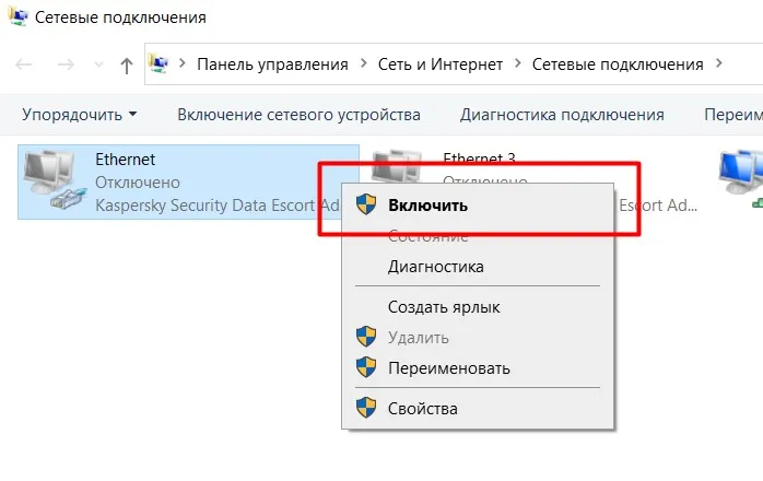 - Make sure that the network connection function is not turned off (it happens after a virus attack). In order to check, go to the main menu of the operating system → Control Panel → Network and Internet. In the new window select "Network and Sharing Center" → "Change adapter settings". Under "Network Connections" locate the "Local Area Connection" and right click on "Enable".![]()