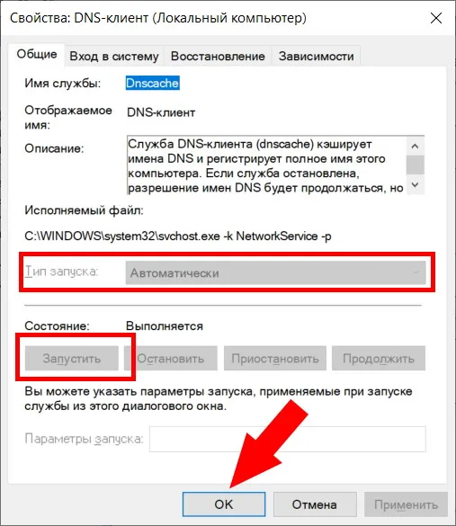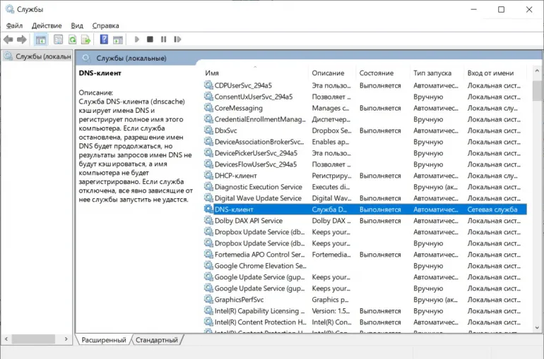 - Check that the DNS client service is configured correctly. To do this, go into the "Services" console in Windows (Start → Administration). Then find the item "DNS Client", in front of which in the "Startup Type" should be "Automatic":![]()