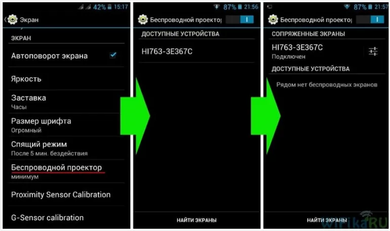 - On the smartphone go to the Settings > submenu "Wireless projector", select the paired screen (it will be one in the list).