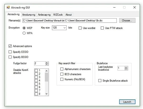 - Click "Launch" and run the analysis. The search will start automatically and can last from 2-5 minutes to 10 hours (depending on the complexity of the keys). - Basically, much - you can work with WEP ⁄ WPA keys and ESSID lists, configure consoles, fix errors, change your passwords, remove WEP-masking, etc. You can, of course, start going through the keys from the dictionary.